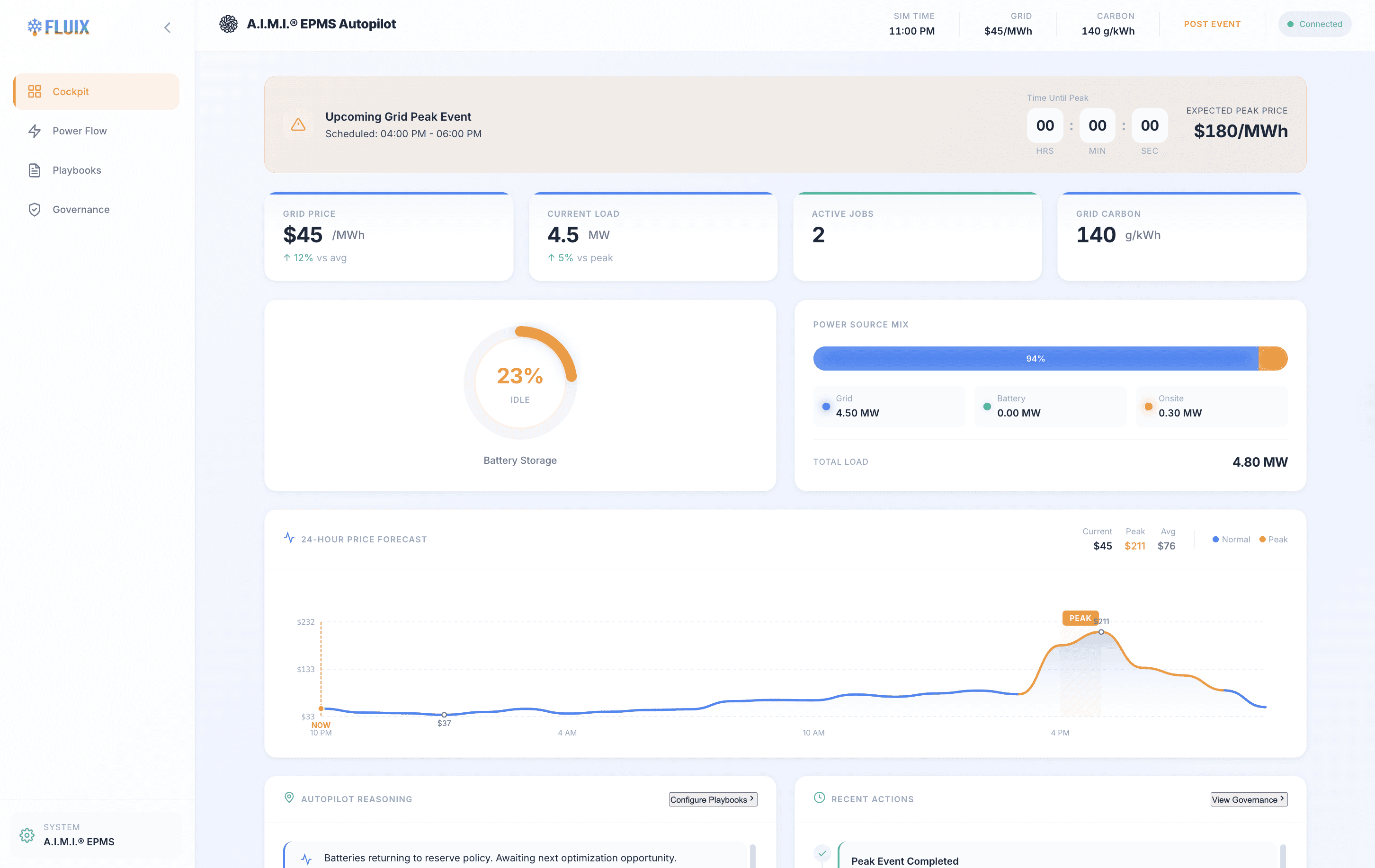 This walkthrough demonstrates how A.I.M.I.® EPMS evaluates grid signals, site electrical state, and workload flexibility in real time, then executes bounded, logged control actions across batteries, generators, and grid draw.