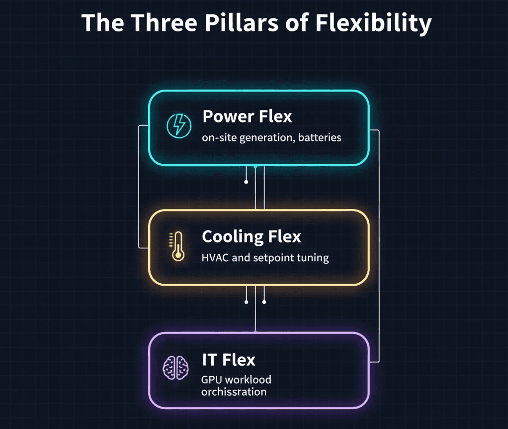 Cooling Flex – Adjusting HVAC systems, fan speeds, and temperature set points to lower load without risking uptime.